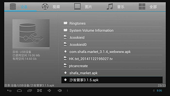 2、插入U盘之后,选择安卓应用——文件管理器——USB设备,打开U盘文件夹,找到沙发管家APK安装包,按照提示进行安装即可。